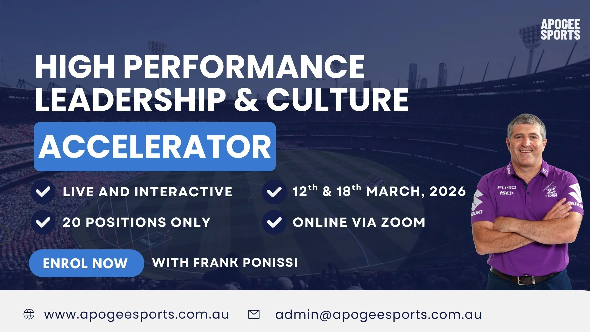 The Certificate in Building High Performance Culture is presented by Frank Ponissi, General Manager of Football at the Melbourne Storm. This course equips aspiring and current rugby league professionals with the knowledge and skills needed to succeed in General Manager and football leadership roles. Through real-world insights and practical frameworks, Frank shares the lessons learned from decades of experience in the NRL, providing participants with a comprehensive view of leadership, operations, culture, and crisis management in elite sport.